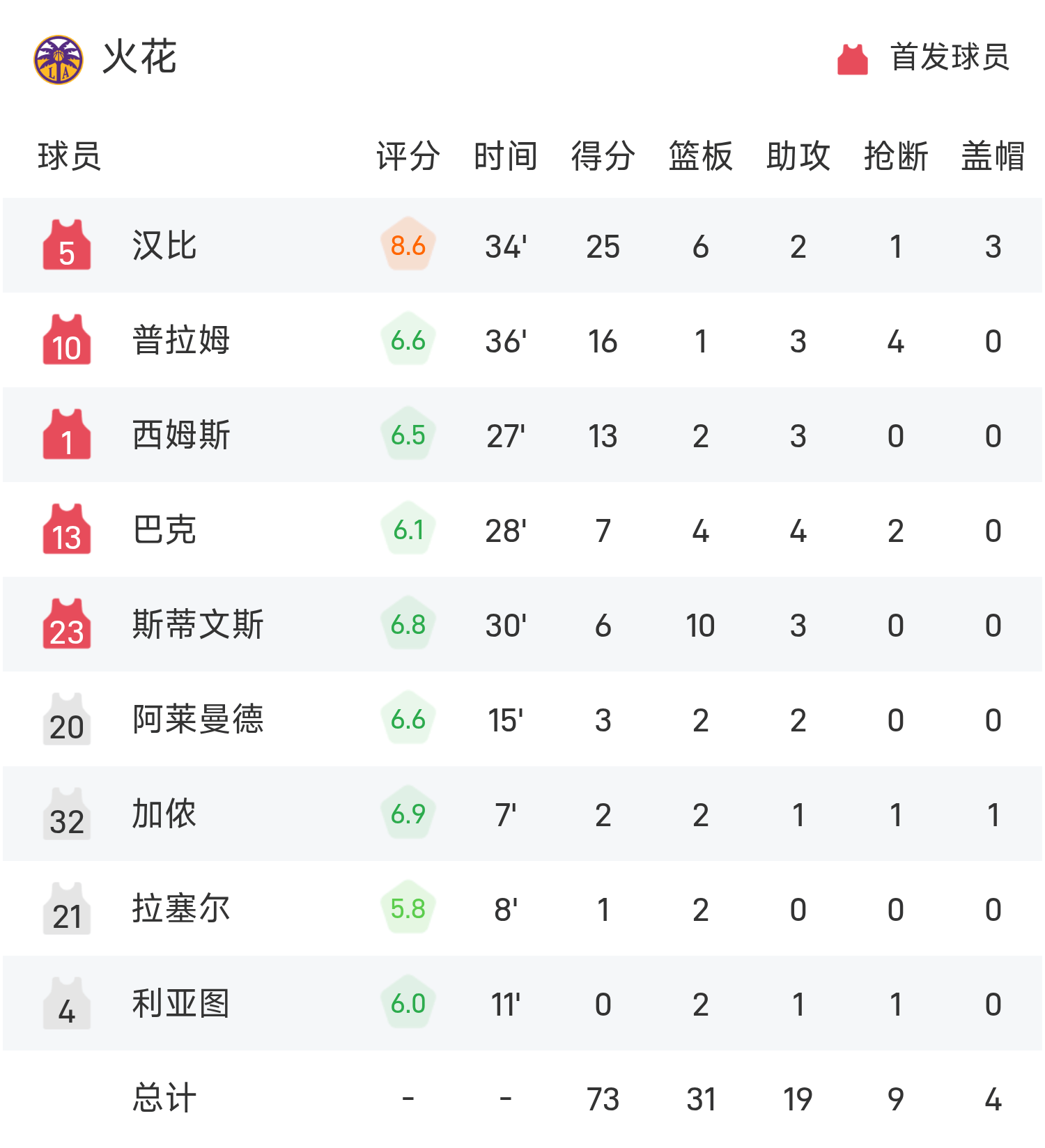 05月24日讯 25赛季WNBA 常规赛,火花对阵女武神。双方全场战罢,火花73-82不敌女武神。雷特得到19分2板3助率队取胜,汉比空砍全场最高的25分6板2助。