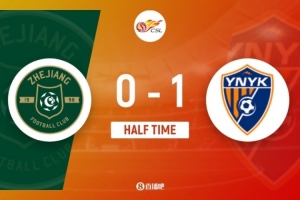 上半场补时10分钟。半场战罢,浙江队0-1云南玉昆。